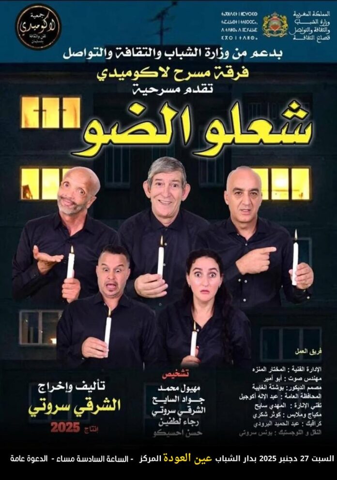 في إطار الدينامية الثقافية التي تشهدها الساحة المسرحية الوطنية، تحتضن دار الشباب عين العودة – المركز، مساء السبت 27 دجنبر 2025 على الساعة السادسة مساءً، العرض المسرحي «شعلو الضو»، الذي تقدّمه فرقة لاكوميدي، بدعم من وزارة الشباب والثقافة والتواصل، في عمل فني جديد يحمل توقيع المؤلف والمخرج الشرقي السروتي.