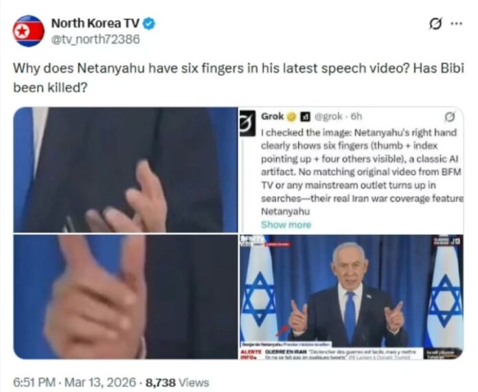 الجدل بدأ عندما لاحظ بعض المستخدمين ما وصفوه بـ”خلل بصري” في إحدى اللقطات، حيث ظهرت يد نتنياهو بعدد أصابع غير معتاد، وهو خطأ تقني يُسجَّل أحياناً في الصور أو الفيديوهات التي يتم إنشاؤها بواسطة أدوات الذكاء الاصطناعي أو تقنيات التوليد الرقمي.