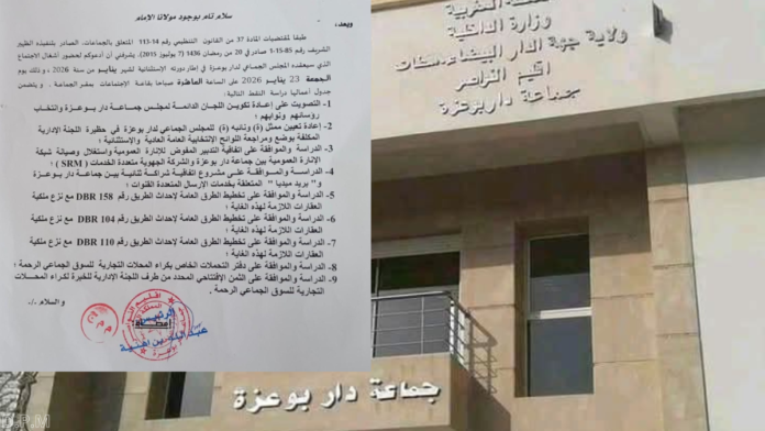 سيعقد المجلس الجماعي لدار بوعزة يوم غد الجمعة 23 يناير 2026 على الساعة العاشرة صباحا بقاعة الاجتماعات بمقر الجماعة دورته الإستثنائية لشهر يناير من سنة 2026، وهي أول دورة برئاسة عبد الله بنهنية بصفته رئيسا منتخبا وبجدول أعمال يضم 9 نقاط أهمها: