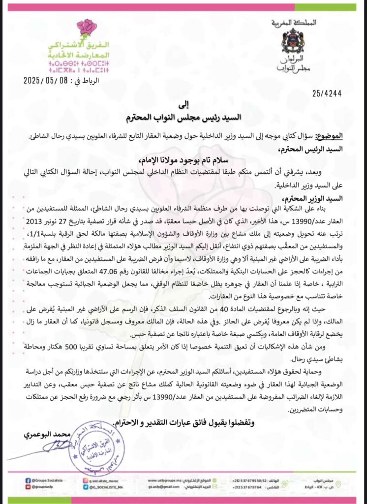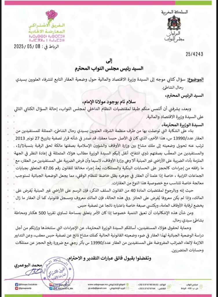 آخر خطواته في هذا المسار الرقابي، تمثلت في توجيه سؤال كتابي مشتركاً إلى كل من وزير الداخلية و وزيرة الاقتصاد والمالية حول وضعية العقار 13990/س بسيدي رحال الشاطئ، عقب توصله بشكاية من منظمة الشرفاء العلويين أحد الهيئات الممثلة للمستفيدين من هذا العقار. وقد أثار النائب البوعمري من خلال هذا السؤال تعارض الإجراءات الجبائية مع الوضعية القانونية للعقار،، وتعارض القوانين المنظمة للأراضي الوقفية، وحالات الحجز على الممتلكات، وما يترتب عنها من تداعيات اجتماعية وقانونية.